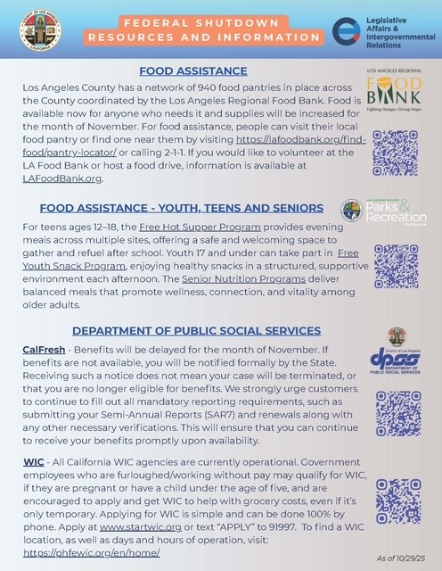 We recognize that the ongoing federal government shutdown has brought uncertainty and hardship to many families, particularly those who rely on CalFresh for essential food support. The anticipated delay in benefits beginning Saturday, November 1 poses a serious concern for households that depend on these resources to meet daily needs.