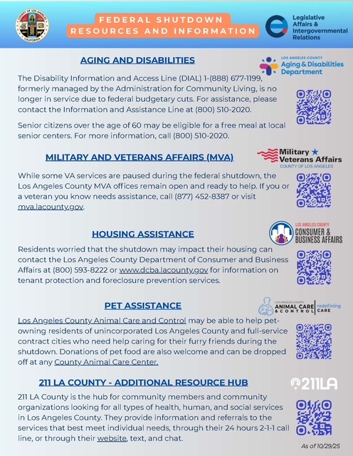 - 211 LA County: Residents can call 2-1-1 or visit 211la.org for referrals to food, housing, health, and social service programs.