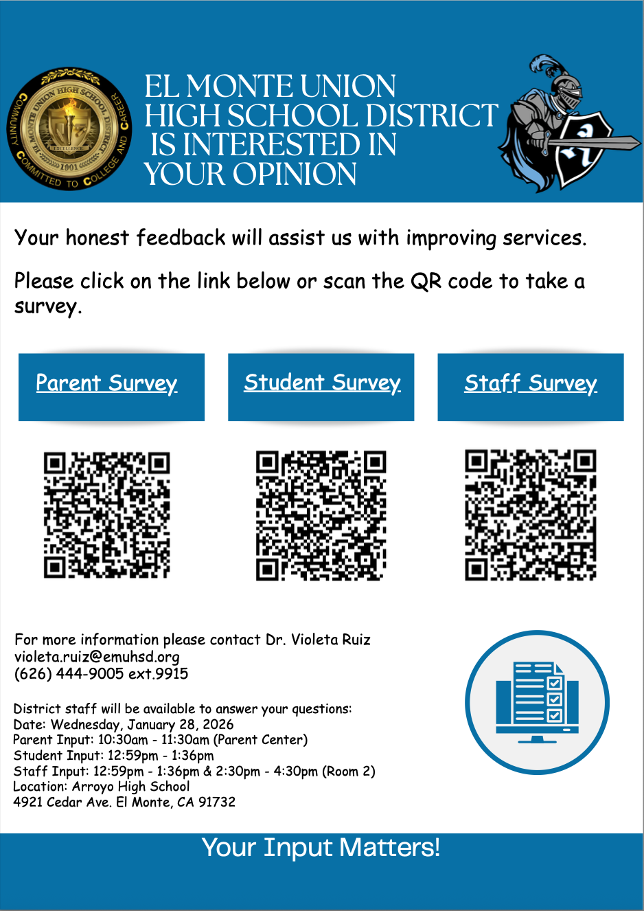 Please review the flyers from all our school sites for dates, times & survey links/QR codes.
